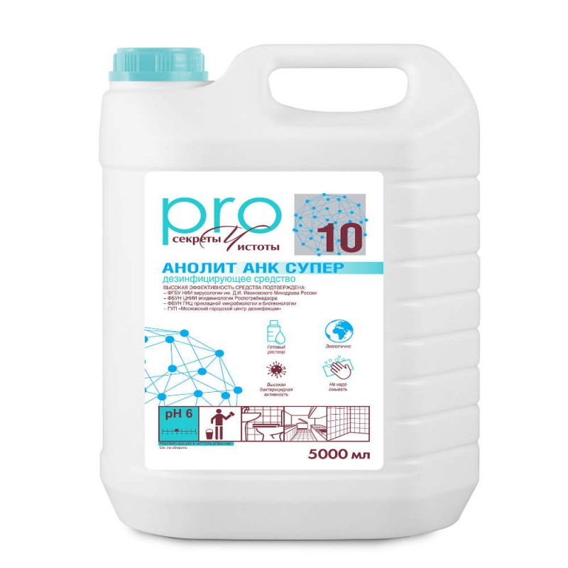 Анолит АНК СУПЕР обладает антимикробной активностью в отношении грамотрицательных и грамположительных бактерий (включая возбудителей туберкулеза, легионеллеза, чумы, холеры, сибирской язвы, туляремии); вирусов (включая возбудителей полиомиелита, энтеральных и парентеральных гепатитов, ротавирусов, энтеровирусов, ВИЧ-инфекции, ОРВИ, гриппа различный типов, «атипичной» пневмонии, парагриппа, герпеса, аденовирусов и др.); патогенных грибов рода Candida и рода Trichophyton; обладает спороцидной активностью.