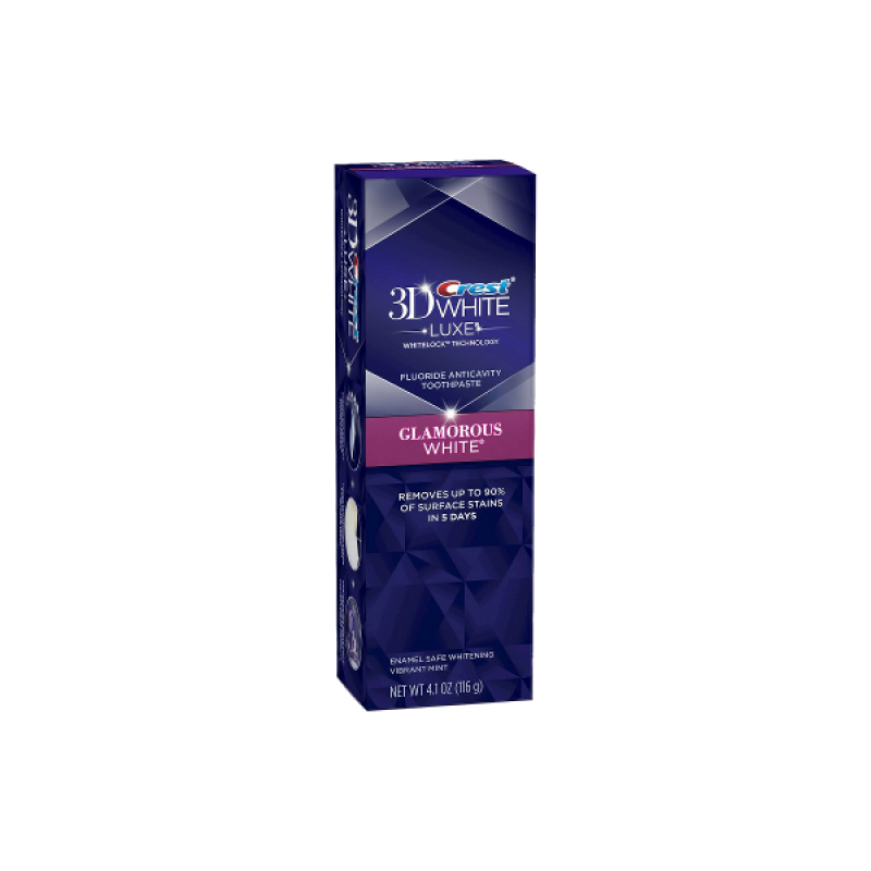 Crest 3D White Glamorous White Luxe - лидер по отбеливанию зубов и придаче блеска зубам, среди аналогичных отбеливающих зубных паст. Зубная паста Glamorous White Luxe новейшая разработка от компании "Procter&Gamble", в переводе как "белый гламур", создана для тех кто умеет быть стильным, заботиться о своем здоровье и идет в ногу со временем! Эта отбеливающая зубная паста разработана по новой уникальной технологии "Whitelock", которая не просто отбеливает зубы и удаляет поверхностные пятна, но и помогает предотвратить формирование новых пятен даже в микротрещинах Ваших зубов. Вы увидите непревзойденный результат и сияющий блеск Вашей улыбки спустя 5 дней использования этой отбеливающей зубной пасты.  Используя зубную пасту Glamorous White два раза в день, Ваша улыбка всегда будет оставаться ослепительно белой, сверкать радуя Вас и всех окружающих!